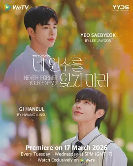 《别忘了你的仇人》是김희진导演的作品,发行于2026年(韩国 / 泰国),由Lee Jawoon , Hwang Junsu等主演,酷吧电影为大家提供别忘了你的仇人完整版免费在线观看,能在手机和电脑上流畅观看别忘了你的仇人高清版(已完结韩语原声),同时还支持是手机投屏。 韩国别忘了你的仇人讲述了:After breaking a classmate’s leg, a young man is sent to juvenile detention. Years later, he meets that same classmate — who unexpectedly confesses his love for him.